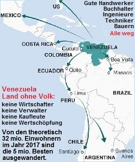 Chavez und Maduro vernichteten kleine Firmen und Bauern, die das Land versorgten. Mechaniker, Elektriker, Techniker, Ingenieur und Andere mit guten Berufen wandertean aus in Länder, in denen ihr Können ihnen selbst und ihren Familien ein Auskommen bietet.