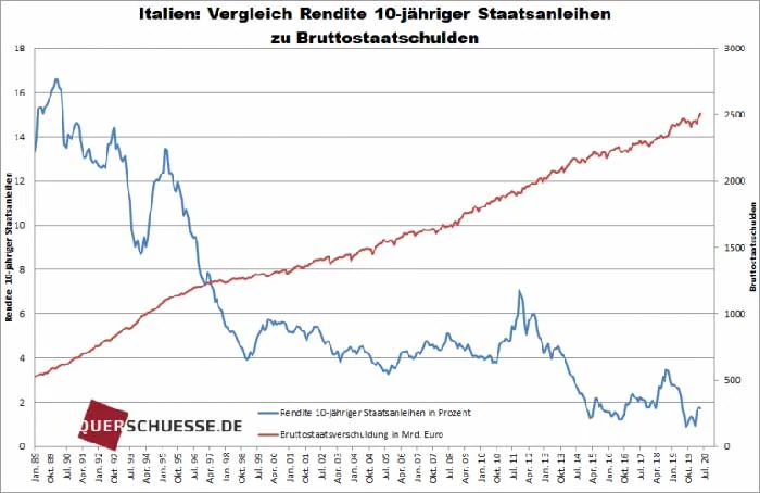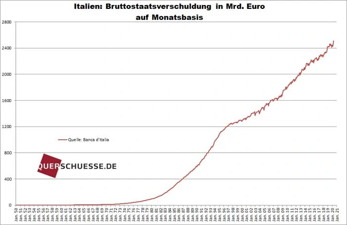 Italien hatte in Vorbereitung der Euro-Einführung seinen Haushalt saniert und die Schuldenquote von bis zu 130 auf etwa 100% reduziert. Durch die von den USA ausgelöste Finanzkrise ist die Verschuldung dann explodiert und bis auf über 150% angestiegen. Seit 10 Jahren ist die Verschuldungsquote aber relativ stabil bei etwa 135%.