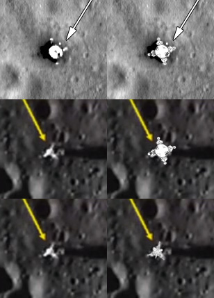 Sofern das obere Foto vom LROC betroffen ist, handelt es sich ganz einfach um eine Fehlinterpretation aufgrund des geringen Kontrastumfangs und der geringen Graustufen-Gradation des Fotomaterials.