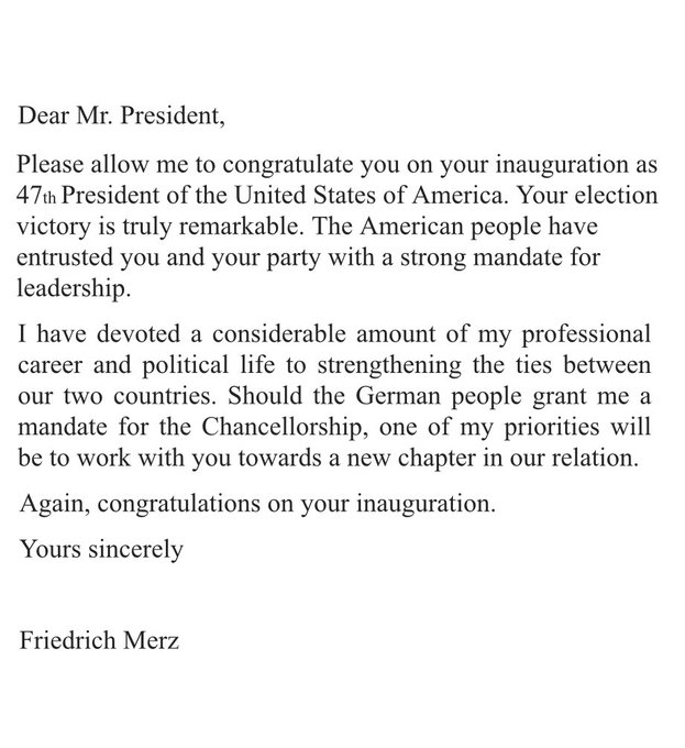 Das schreibt Friedrich Merz an Donald Trump zu Inauguration. Das Original ging handschriftlich an den US-Präsidenten.