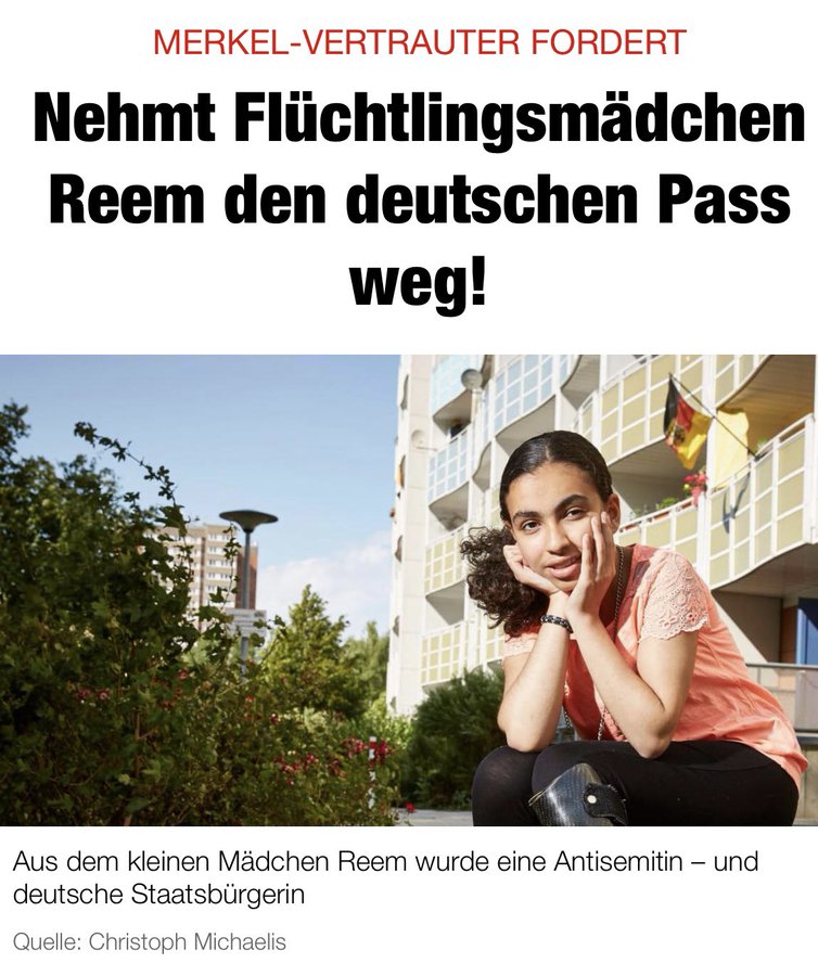 Schon Familie Chebli wurde komplett mit deutschen Pässen ausgestattet, obwohl der Vater ein unintegrierter, arbeitsloser Analphabet war. Also tut jetzt nicht so, als wäre das nicht alles bekannt. Genau wie diese Reem auch schon immer antisemitischen Dreck gepostet hat. Aber wer nimmt ihr jetzt den Pass weg? Hier darf niemand ausgebürgert werden, der dann staatenlos wird. Ehrlich. Ich kotze so dermaßen, dass ich gezwungen werde mit solchen Subjekten meine Staatsbürgerschaft zu teilen.