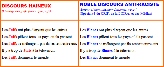 "Die Medien haben uns ihre antirassistische Doppelmoral so sehr eingetrichtert, dass derselbe Satz in unseren Köpfen anders klingt, je nachdem, ob er mit „Juden“ oder „Weißen“ beginnt. (Vergleichstabelle aus einem alten Blog von Hervé Ryssen)." https://x.com/tototoutcourt/status/1914641251510386946