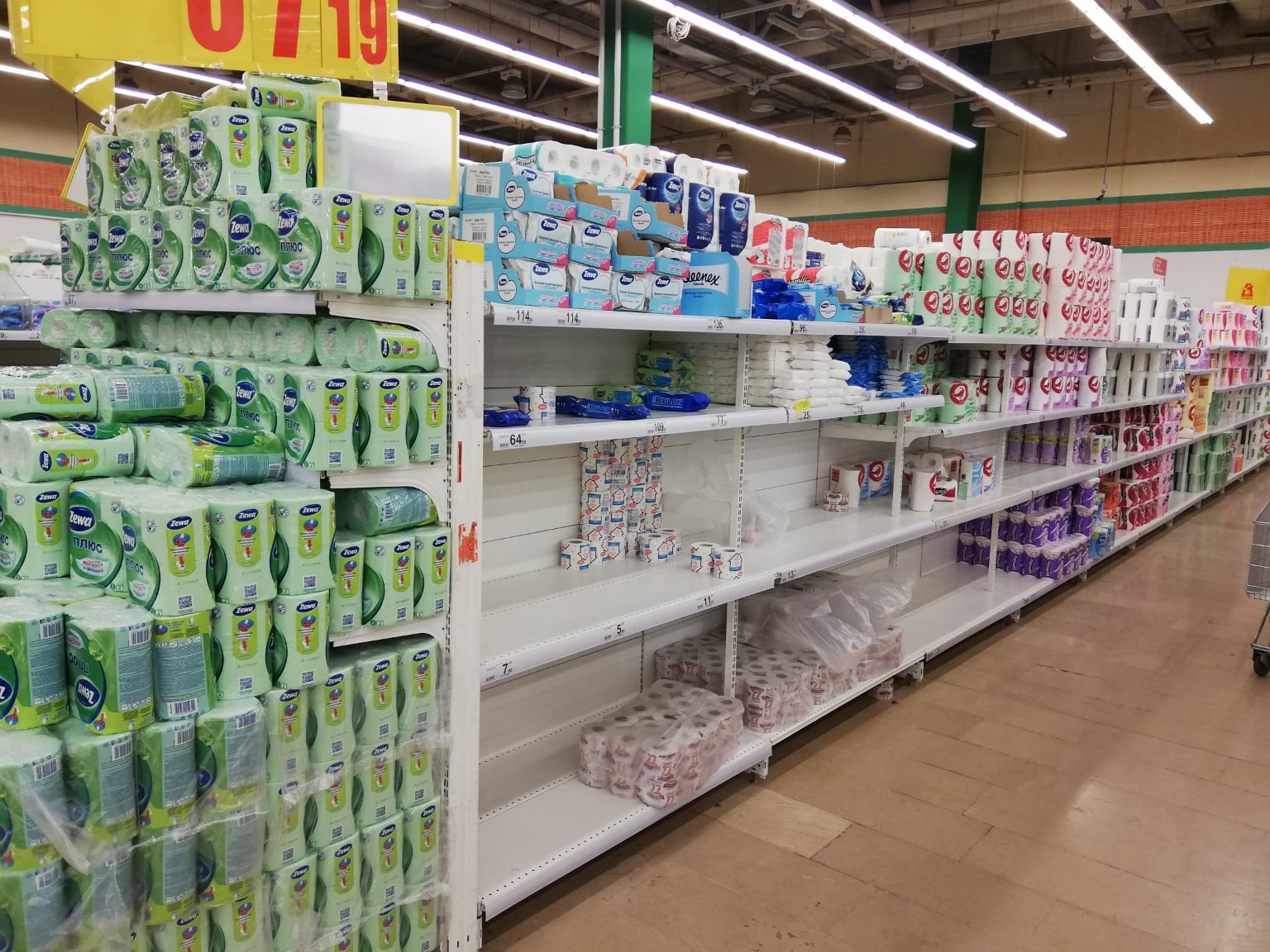 Jetzt um kurz vor halb 8 am Abend ist das Toilettenpapier schon ziemlich angegriffen, komplett leer sind aber nur einige Sorten von der günstigen Marke, die 6 Rubel pro Rolle kosten. Die teureren Sachen (Zewa etc.) sind ausreichend vorhanden. Küchenpapier ist noch komplett voll.