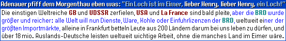 Oft hör ich dazu: "Ihr habt doch den Krieg angefangen!" Das ist haltloser Quatsch. Meine Familie hat keinen Krieg angefangen, aber ich hab meiner Familie geholfen den Jahrhundert-Krieg 1914-1989 der Alliierten gegen Deutschland zu gewinnen, trotz der Pläne, die Stalins Vertrauter, Georgi Dimitrow, mit Henry Morgenthau seit 1936 ausheckte: Deutschland platt 1940, und Europa, Mittelost und Nordafrika neu aufgeteilt.