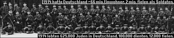 Bis WK1 kämpften Juden an allen Fronten für ihr jeweiliges Vaterland. Auch gegen Juden. In allen Ländern, in denen sie lebten, zahlten sie einen oft sehr hohen Blutzoll. Freiwillig. Ohne staatlichen Zwang. Es ist zwar allgemein bekannt, aber vielleicht doch nicht bei Weicheiern und Schlampen der Nullbock-Generationen mit Pisa-Abi und Bafög-Studium, das sie zum arbeitsunfähigem akademischem Proletariat machte.