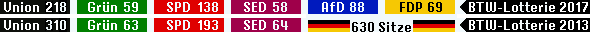 Nun ist die obigen Hochrechnungs-Seite schon von 630 auf 690 Sitze geklettert, und es ist zu befürchten, daß der Bundestag auf über 725 Sitze erweitert wird. Nix Genaues weiß man nicht. Klar, es hätte noch übler werden können: Rot-Grün-SED-Diktatur von Schulz mit Gestapo-Ministerin Katrin und Gulag-Ministerin Petra unter Bundespräserin Alice und Erdogan-Statthalterin Claudia.