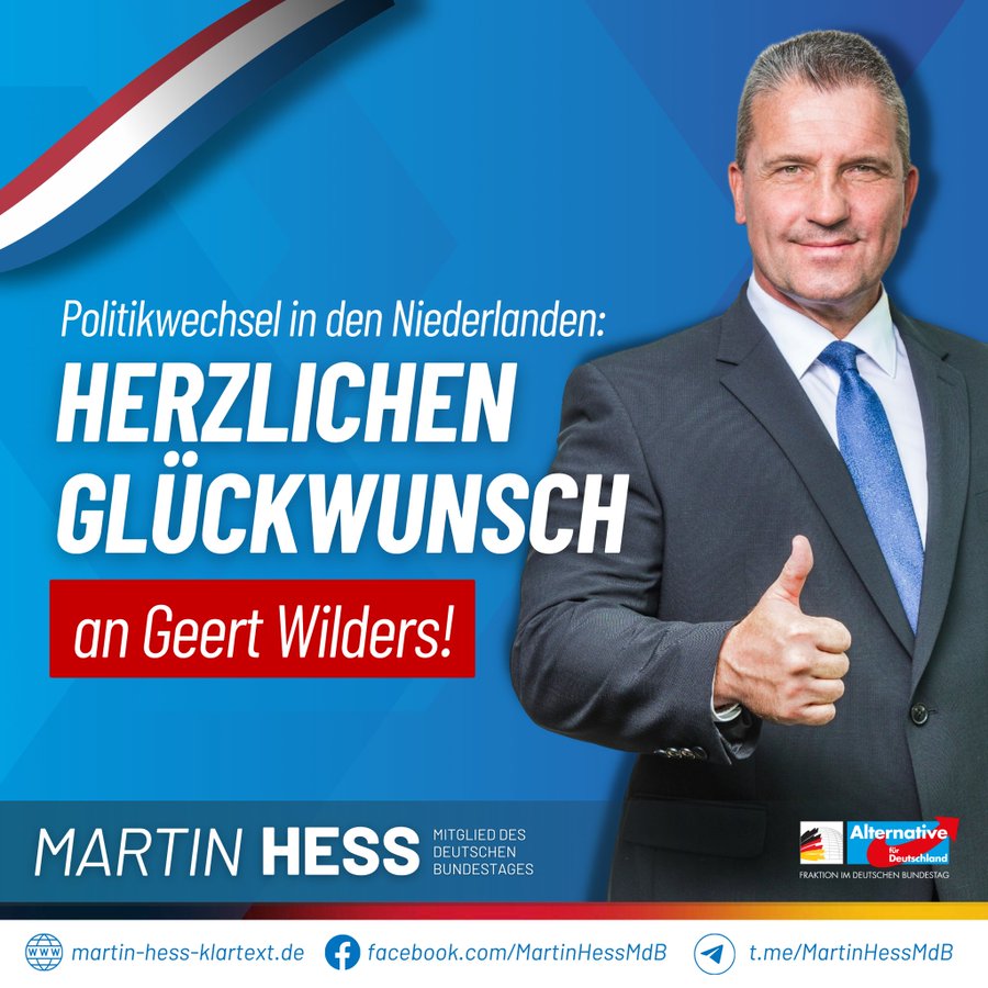 : "Die Niederlande haben gewählt: Geert Wilders' #PVV wurde mit Abstand stärkste Kraft. Das zeigt: Nicht nur in Deutschland wollen die Bürger den politischen Wandel, sondern überall in Europa. Wir gratulieren Geert #Wilders zu seinem grandiosen Erfolg und freuen uns schon jetzt auf die kommende Europawahl!" #AfD