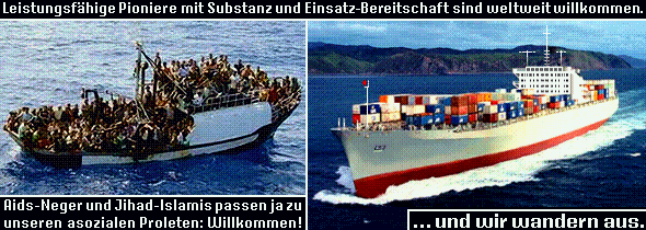 Aber BRD-Import-Proleten wollen hier ebenso feist leben wie deutsche Proleten mit ihren mageren Leistungen oder gar völlig ohne eigene Leistung. Wer also den Zustrom von Import-Proleten reduzieren will, muß alle Gelder für Erwerbslose streichen und die Löhne für ungelernte Fließband-Hengste und Erwerbs-Schlunzen mit ihren 12 an Maschine oder PC eingedrillten Griffen auf das Lohn-Niveau von China setzen.