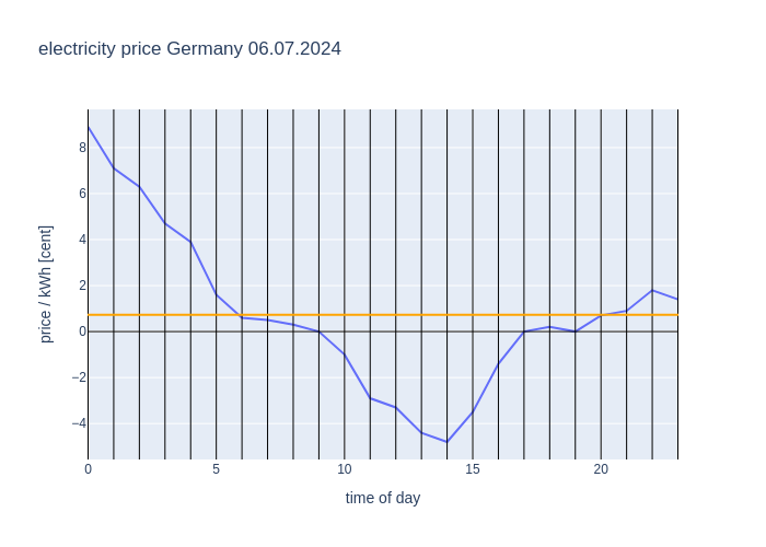 #Germany 06.07.2024 Durchschnitt: 0,733 Cent/kWh Von Mitternacht bis zum späten Vormittag sinken die Preise und erreichen um 9 Uhr morgens ihren Tiefststand. Anschließend steigen die Preise bis zum frühen Abend an, bevor sie sich gegen 19 Uhr stabilisieren. #tibber