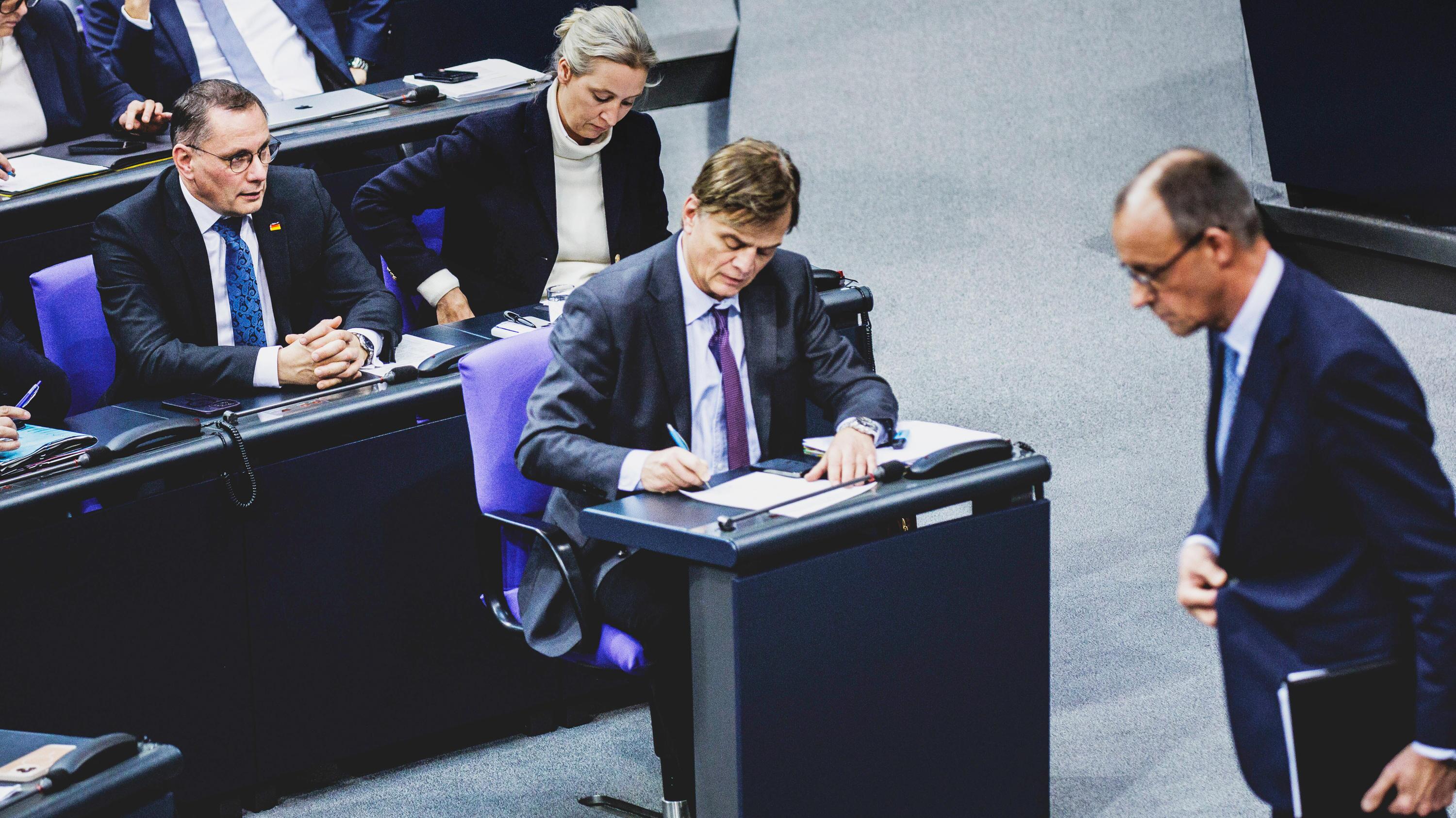 Friedrich Merz läuft an der AfD-Fraktion im Plenarsaal des Bundestags vorbei. Die Union will die AfD politisch bekämpfen. Doch seit Merz Amtsantritt als Kanzler hat sie diesbezüglich wenig vorzuweisen. © picture alliance / photothek.de/Florian Gaertner