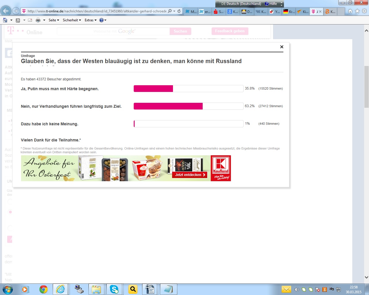 Die Behauptung die Deutschen würden von russischer Propaganda berieselt zieht schon deshalb nicht weil kaum ein Deutscher russische Medien konsumiert. Die Wahrheit ist viel einfacher. Die meisten Deutschen glauben den Amis und der Monopolpresse nicht mehr alles und haben in Teilen begonnen selbst zu denken.