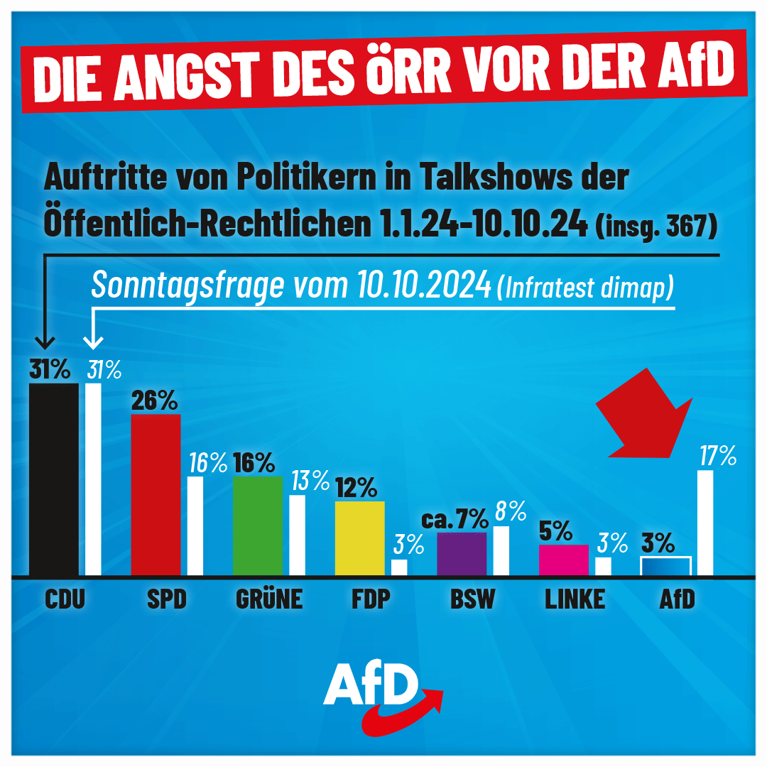 Vielleicht hat es auch damit zu tun, daß die AfD nicht oft zu Wort kommt. Diskussionsrunden dauernd mit Wagenknecht aber ohne AfD und so weiter. Da wird gezielt manipuliert und die AfD-Positionen werden verzerrt wiedergegeben. Z.B. wird es ja so dargestellt, daß die AfD das System und seine demokratische Grundordnung ablehnt. Man schürt also gezielt Angst vor einer Diktatur.