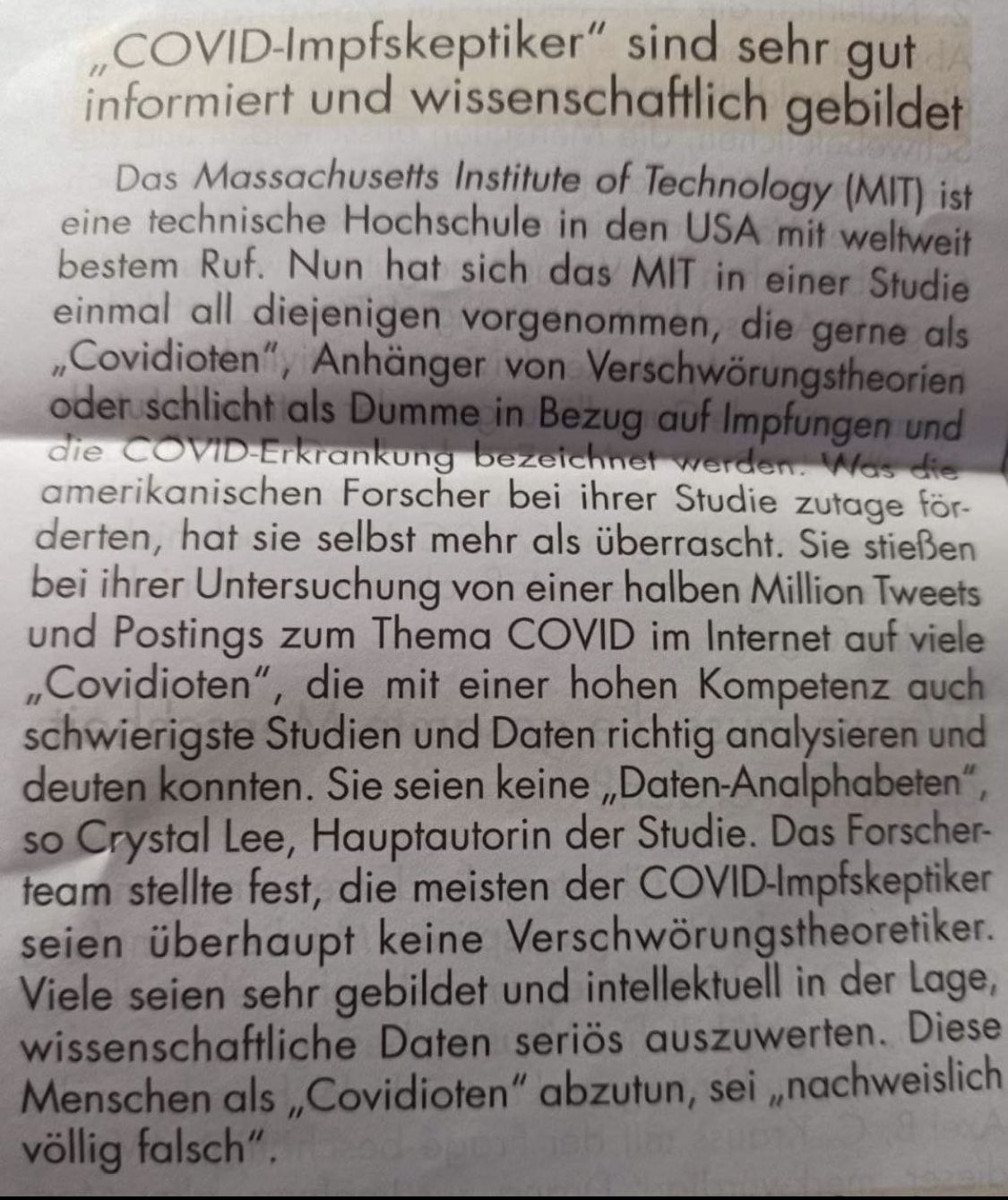Das Massachusetts Institute of Technology (MIT) hat sich in einer Studie einmal all diejenigen vorgenommen, die gerne als „Covidioten", Anhänger von Verschwörungstheorien oder schlicht als Dumme in Bezug auf Impfungen und die COVID-Erkrankung bezeichnet werden.