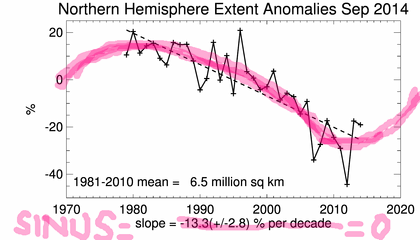 Die Kreativität liegt GANZ bei den Realitäts-Leugnern der Ideologen von der Church-of-global-warming. Sie malen Geraden in Sinus-Kurven, so wie hier mit DEREN dicken Pfeil angedeutet: