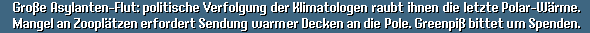 Weder Kotzfisch noch ich haben behauptet, daß Vereisung der Erde bereits zunimmt. Ich schrieb: "Und für jeden kalbenden Gletscher kommt weit mehr von Meeren, Flüssen anderen offenen Gewässern und Lebewesen verdunstetes Wasser als Schnee wieder runter und wird zu Eis. Schlittenhunde, Rentiere und ihre Halter erzeugen mit jedem Ausatmen neue Eiswolken." Dagegen behauptest Du ohne Beweis dafür Eis nähme ab: