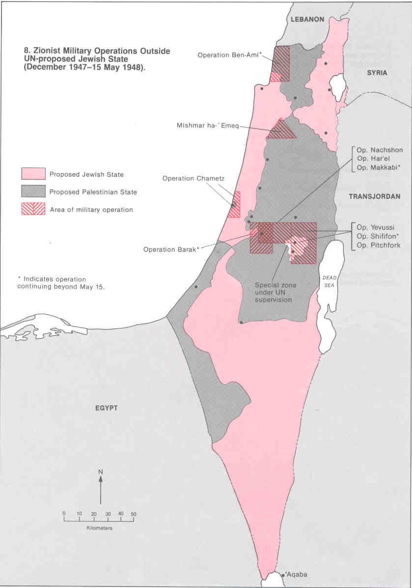 Ab April 1948 fingen jüdische Truppen, Gebiete außerhalb des ihnen zugeteilten Teilungsgebiets zu erobern oder zu zerstören/entvölkern. Hier eine Grafik:Zitat: