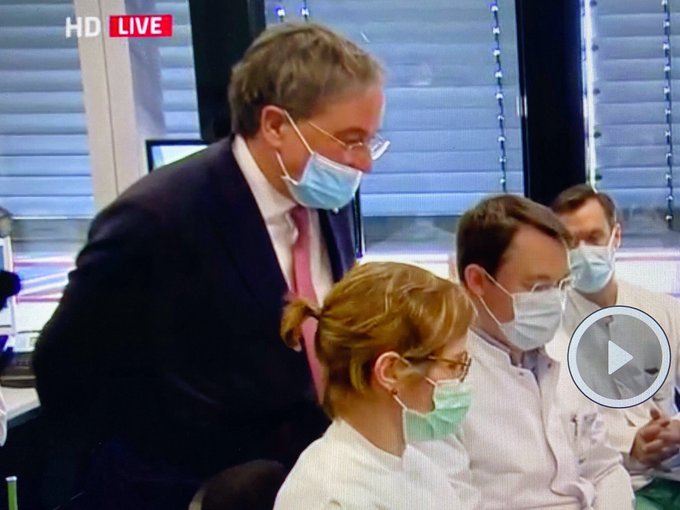 Armin Laschet, Ministerpräsident von Nordrhein-Westfalen, gibt bei der Eröffnung des "Virtuellen Krankenhauses" in Aachen ein schlechtes Beispiel: Er trägt seine Maske zwar über dem Mund, doch die Nase bleibt frei.