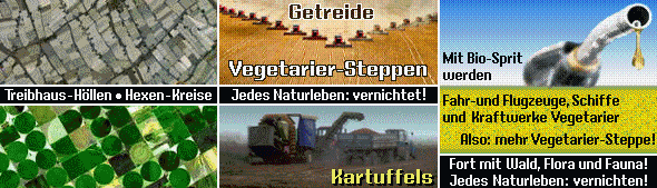 Weit übler als Leute, die mit KFZs und sonstwie Sprit verbraten oder im Haus und in der Industrie Strom brauchen, sind Proleten, die mit ihrer Konsum-Gier Müll-Gebirge und Müll-Inselwelten produzieren, und Vegetarier, die mit immer mehr Vegetarier-Steppen die Erde versauen. Mit jedem Stück Wald oder Busch das zu Vegetarier-Steppe wird, rotten Vegetarier zahlreiche Tiere und Pflanzen aus: