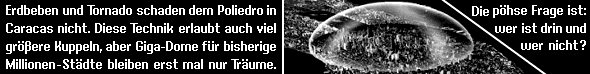 Wer ist drin und wer nicht? Diese Frage hält viele Städte davon ab Mega-Dome zu planen, und sie werden froh sein, wenn ein Verbund von Einzel-Kuppeln möglich wird. Bei neuen Kuppel-Städten und Kuppel-Dörfern ist das viel einfacher: drin sind nur Leute, die ihre Kuppeln auch selbst bezahlen, mit Leistung, mit Geld, mit Ansehen als Ehrenbürger oder wie auch immer.