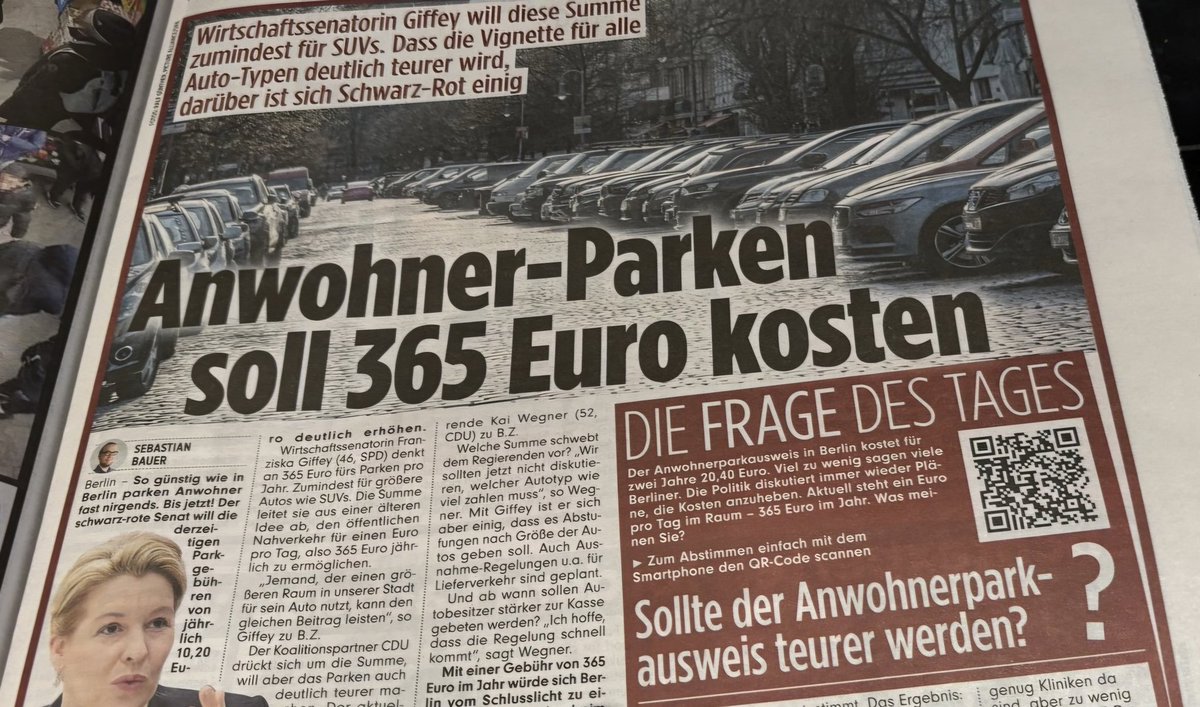 Die SPD will das Anwohner-Parken in Berlin auf 365 Euro erhöhen!