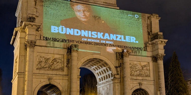 Er könnte doch eine Erklärung auf das Siegestor in München beamen?