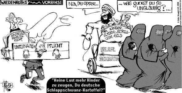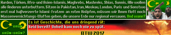 Die Qualität der islamischen Bedrohung ist nun mal eine vollkommen andere als die des Christentums. Und die Einschläge kommen näher. Die militante Religions-Ideologie Islam erobert ein Land nach dem anderen. Die Anzahl der Salafisten hat sich in unserem Land in kürzester Zeit verdoppelt und die Zahl angeblich harmloser Moslems in Deutschland und in Europa wächst und wächst. Mehr als 37.500 verfassungsfeindliche Islamisten zählt der Verfassungsschutz inzwischen. Die mulsimischen Parallelgesellschaften haben sich längst verfestigt, mit eigener Infrastruktur, eigener zivilen Rechtsprechung und eigenen Regeln abseits grundgesetzlicher Normen. Grüne, Linke, Evangelische Kirche und weite Teile der anderen Parteien unternehmen alles in ihrer Macht stehende, diesen Zustand festzuschreiben und weiter auszubauen und das Land mit einem dichten Netz von Moscheen, Koranschulen und No Go Areas für "Ungläubige" zu überziehen.