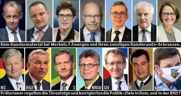 Falls Söder kippte, weil er ein Weichei ist, ersparte er uns einen Weichei-Kanzler. Volker Bouffier in Hessen, Harry Glawe in Meck.-Vorp. und Reiner Haseloff in Sachsen-Anhalt sollten durchaus mit zu den Prätorianern gezählt werden, und Laschet wurde ja nicht einstimmig als AKK-Ersatz zum CDU-Häuptling gewählt: eine neue Mehrheit für einen Besseren ist noch vor der BTW möglich.