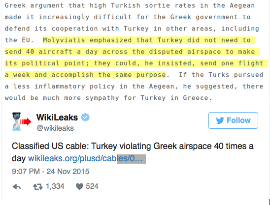 In dem Zusammenhang ist interessant das Griechenland seit Jahren Beschwerden einreicht, weil die Tuerkei den griechischen Luftraum permanent (40mal am Tage sogar) verletzen: