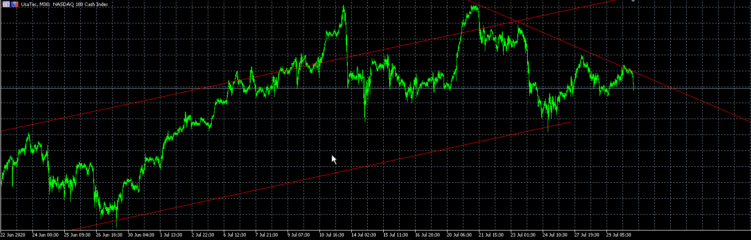 Ich habe mal nachgesehen, wie dein "Kanal" da aufgebaut ist. Die Hochs des 17. April und des 10. Juni sowie der 10. Juli als auch der 11. Mai ergeben bei mir die obere Linie, parallel dazu die untere (21. April, --- 26. Juni). Bei dir ist das völlig anders, dein "Kanal" ist getürkt. Wir befinden uns bereits UNTERHALB des Aufwärtstrendkanals, es gibt eine Widerstandslinie von 10.660 Punkten, eine Unterstützung von 10.500 Punkten UND EIN ABWÄRTS GERICHTETES DREIECK.