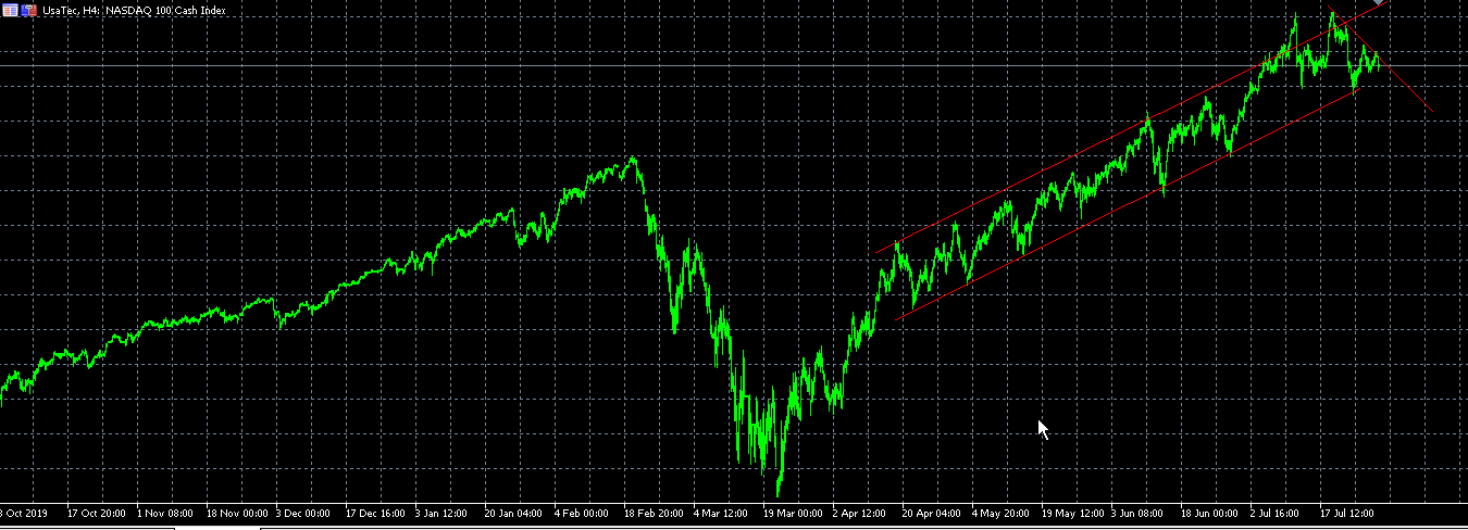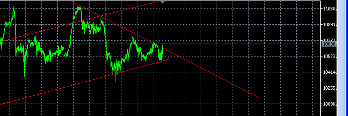 Ich habe mal nachgesehen, wie dein "Kanal" da aufgebaut ist. Die Hochs des 17. April und des 10. Juni sowie der 10. Juli als auch der 11. Mai ergeben bei mir die obere Linie, parallel dazu die untere (21. April, --- 26. Juni). Bei dir ist das völlig anders, dein "Kanal" ist getürkt. Wir befinden uns bereits UNTERHALB des Aufwärtstrendkanals, es gibt eine Widerstandslinie von 10.660 Punkten, eine Unterstützung von 10.500 Punkten UND EIN ABWÄRTS GERICHTETES DREIECK.