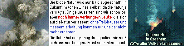 1 vernünftiger Vulkan bläst am Tag mehr als 10 Jahre Industrie und Verkehr an Schwermetall und anderen Schadstoffe, aus einem 6.000 hohem Kamin, in die Atmosphäre und bis in die Stratosphäre, damit der Mist auch die andere Seite der Erde erreicht. Aber wir machen gute Fortschritte an Kongo und Amazonas, und Borneo haben wir bald schon völlig entwaldet: