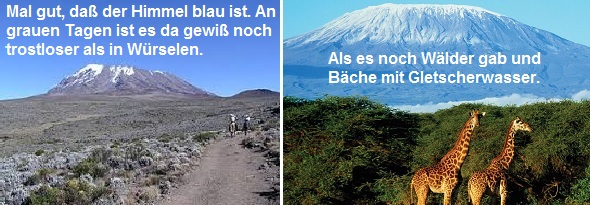 Das Gletscher-Eis auf dem Kilimandscharo ist weg. Wir taten es. Nicht Sonne, Industrie, Verkehr, Krokodile oder sonstige Verdächtige. Wir holzten die Wälder ab, rund um den Kilimandscharo, und schufen Vegertarier-Steppe für Öko-Sprit-Plantagen, die nicht genug verdunstet zur Bildung von Wolken, die Schnee auf den Kilimandscharo bringen.