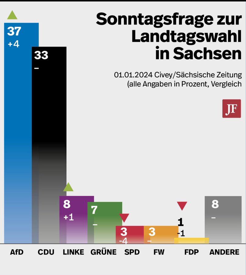 Also: Die Vertreterin einer Partei, die in Sachsen bei 3% steht, will eine Partei verbieten, die in Sachsen bei 37% steht.