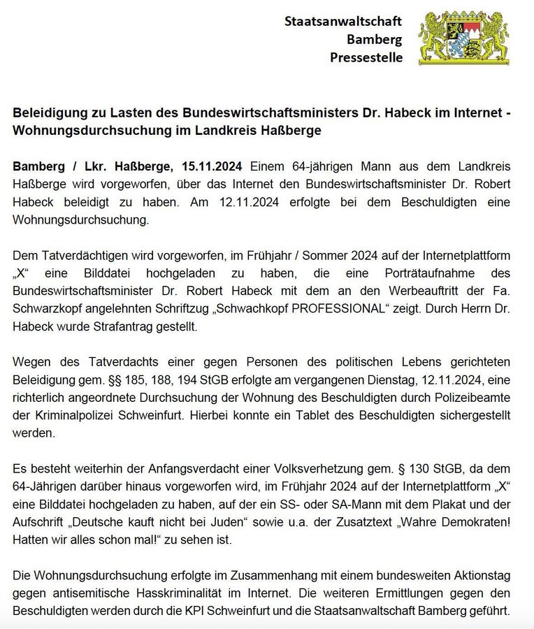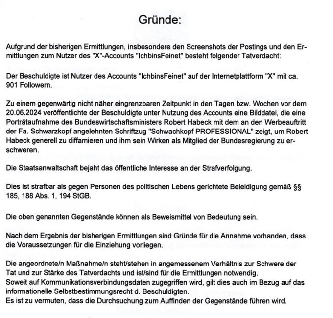 Zu einem gegenwärtig nicht näher eingrenzbaren Zeitpunkt in den Tagen beziehungsweise Wochen vor dem 20.6.2024 veröffentlichte der Beschuldigte unter der Nutzung des Accounts eine Bilddatei, die eine Porträtaufnahme des Bundeswirtschaftsministers Robert Habeck, mit dem an den Werbeauftritt der Fa. Schwarzkopf angelehnten Schriftzug ‚Schwachkopf PROFESSIONAL‘ zeigt, um Robert Habeck generell zu diffamieren und ihm sein Wirken als Mitglied der Bundesregierung zu erschweren.“
