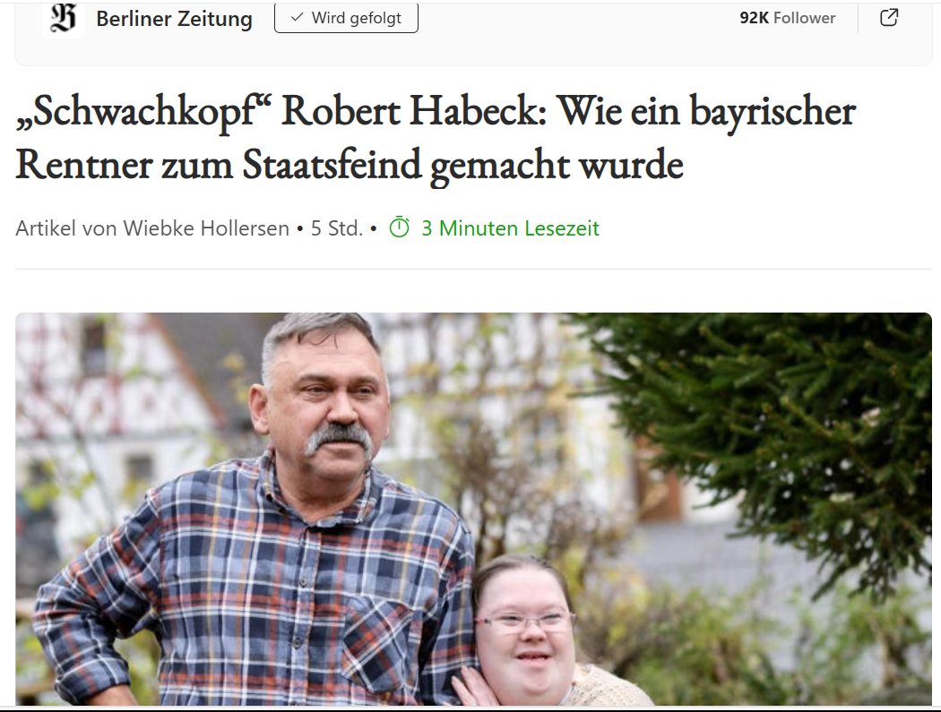 Das Ganze ist für Habeck und seine zensurgeilen Genossen nach hinten losgegangen. Warum? Weil der vom Staat terrorisierte Rentner sich an die Öffentlichkeit gewandt hat und sich nicht einschüchtern lassen hat.