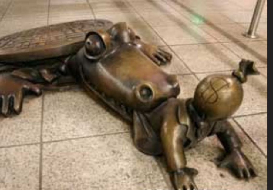 Diese Statue eines Reptils, das ein Kind in die Kanalisation zieht, befindet sich in Brooklyn, New York. Derselbe Bezirk, in dem im Januar 2024 die unterirdischen Tunnel unter der Synagoge entdeckt wurden. Der Kopf des Kindes ist als Geldbeutel dargestellt. Kinderhandel ist das größte Geschäft der Welt.