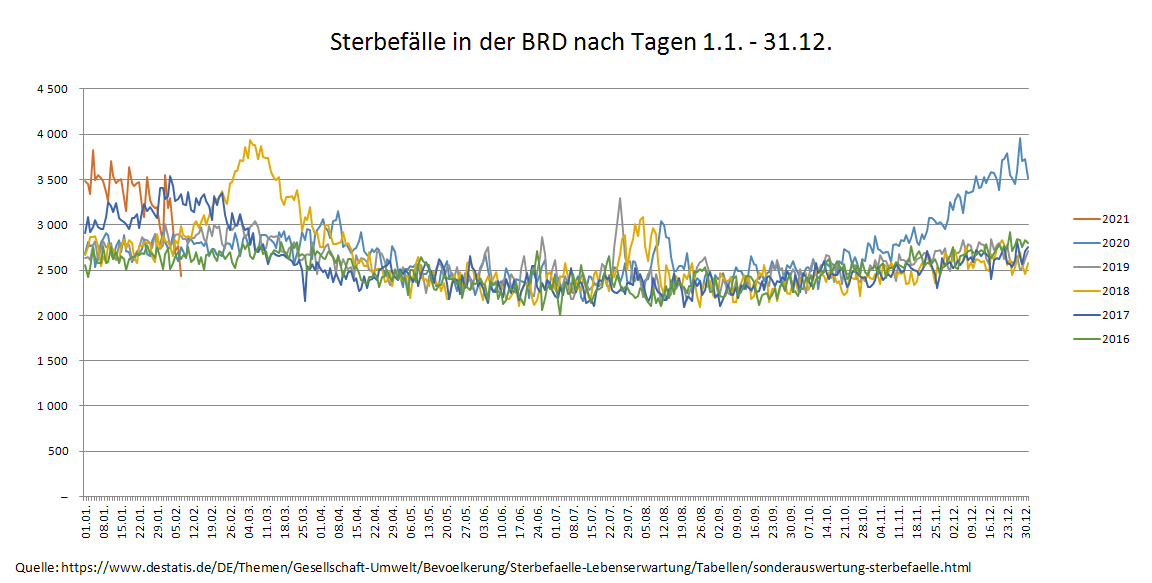Man sieht, dass es eigentlich nur zwei Abweichungen gibt, die Grippewelle 2018, wo in der Spitze genausoviele starben wie bei der sog. Corona-Pandemie Dezember 2020.