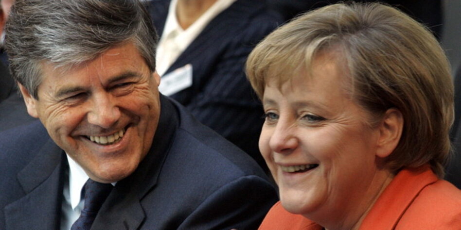 Merkel und Deutsche-Bank-Chef-Ackermann, lange Zeit ein harmonisches Paar. Das Verhältnis war so eng, dass man sogar Geburtstag zusammen feierte. Und Merkel wirkte auf Pressefotos neben Ackermann immer vollkommen anders als sonst (die "besten" Bilder, auf denen die Augen nur so blitzen, sind vorsorglich aus dem Netz entfernt worden):