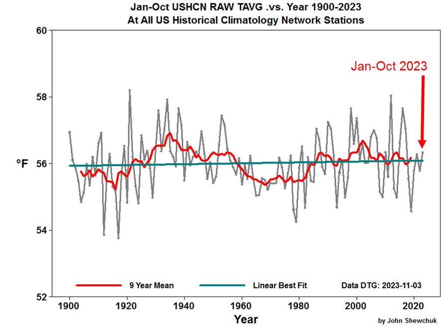 Die USHCN-Rohdaten (oder beobachteten Daten) von Januar bis Oktober 1900 bis 2023 zeigen eine sehr leichte Erwärmung (oder im Wesentlichen eine Pause). Und dennoch war die Vergangenheit, zB im Mittelalter oder beim Römischen Optimum, wärmer als die Gegenwart.