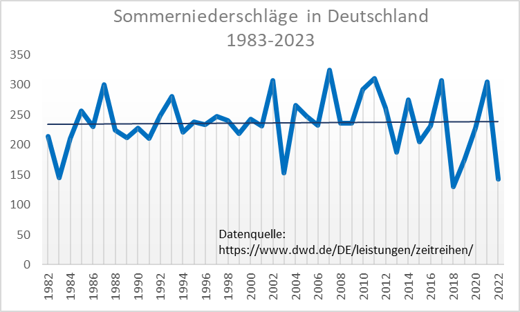 Sommerniederschläge in Deutschland, letzte 40 Jahre: Kein echter Trend erkennbar, wenn überhaupt, dann eine leichte Zunnahme.