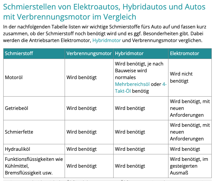 Es ändern sich teilweise die Anforderungen an die Schmierstoffe, aber Elektroautos werden weiterhin Öl benötigen. Das gilt zum Beispiel für Bauteile wie Getriebe, Radlager und Klimaanlage. Das klassische Motoröl, wie es in Verbrennungsmotoren gebraucht wird, wird jedoch in E-Autos nicht mehr eingesetzt.