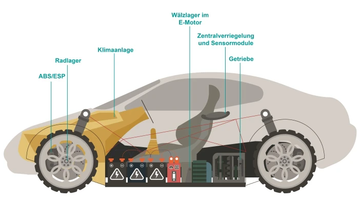 Schmierfette werden im Elektromotor, in Nebenaggregaten und in der Zentralverriegelung eingesetzt. Sie müssen im E-Auto harten Bedingungen trotzen und z.B. im Wälzlager des Elektromotors hohe Temperaturen und Drehgeschwindigkeiten auffangen. Gleichzeitig müssen die Fette mit vielen Materialien wie Kupfer, Kunststoffen und Elektronikbauteilen verträglich sein.