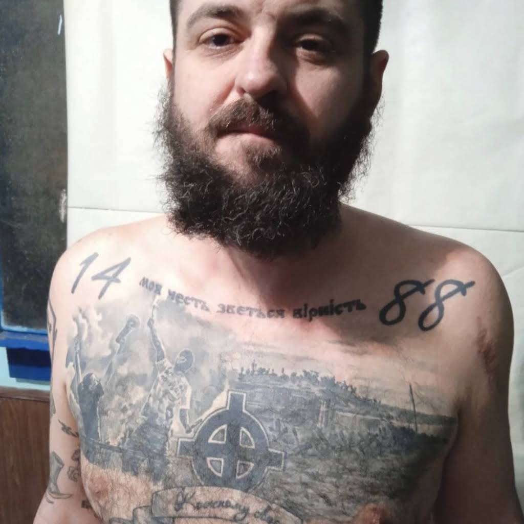 Ein Mann mit Hakenkreuztattoos im Gesicht und an halben Körper, der Zivilisten getötet hat, in den Vereinigten Staaten mehrfach vorbestraft ist und einer Reihe von Neonazi-Vereinigungen vorsteht.