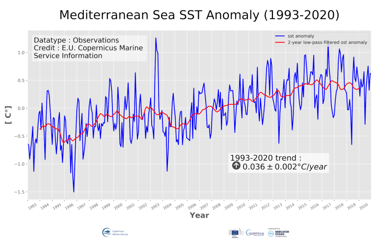 Da helfen keine Pillen mehr! Zeitreihe der Temperaturanomalie für das gesamte Mittelmeer von 1993 bis 2020 – Copernicus Marine Service
