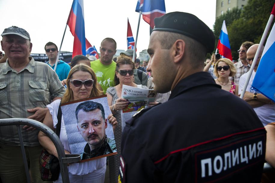 Letzten drei Bilder aus Moskau, man erkennt die Gestalt des Geheimdienstoberst Girkin auf dem Poster (Sympathien für einen Geheimdienst-Brandstifter wecken, nein wie rührend) sowie Fahnen der 'Volksrepublik Donezk'. "Unsere" Terroristen gehen da unter, das darf doch nicht sein?!