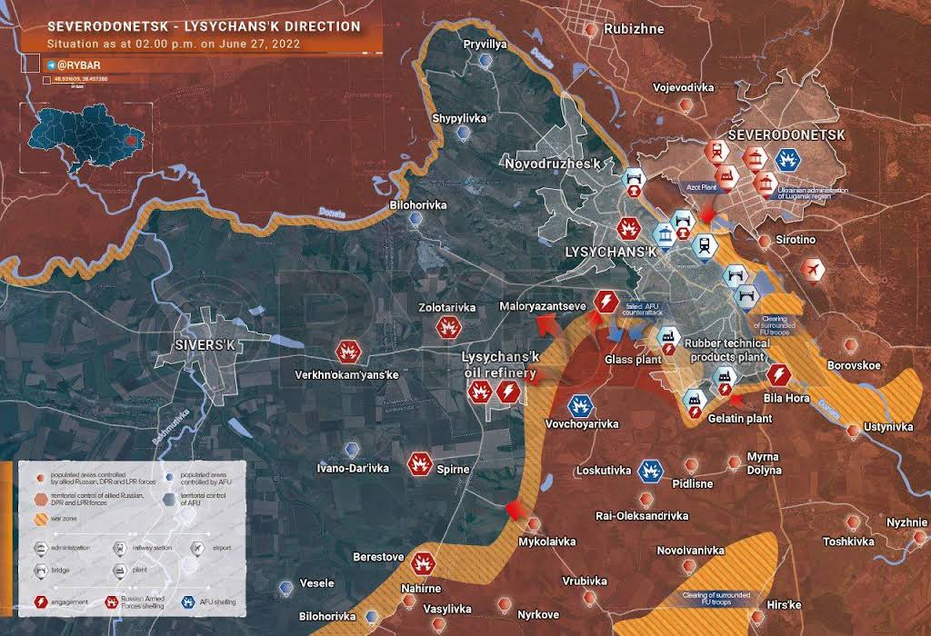 Wie man unschwer erkennen kann, entsteht ein weiterer Kessel um Lyssytschansk, aus der die Ukrainer versuchen, verzweifelt zu fliehen.