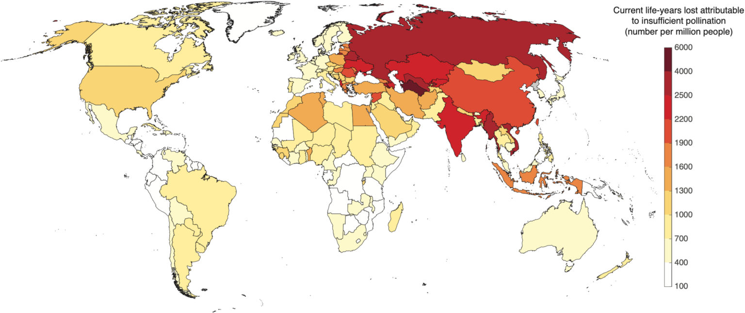 In welchen Ländern durch ungenügende Bestäubung gehen am meisten Lebensjahre verloren gehen. © Myers et al.