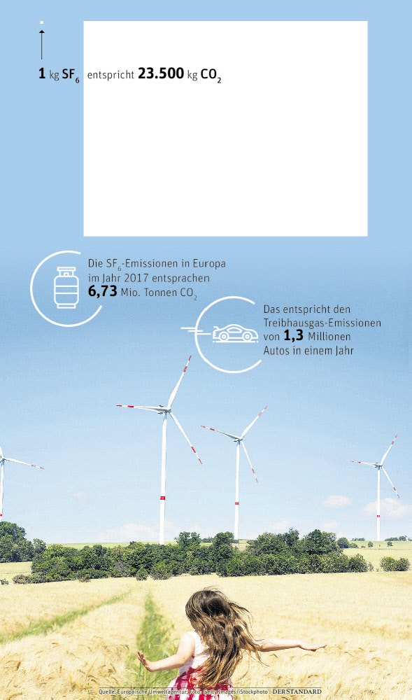 Doch wie sauber ist Windkraft wirklich? Eine Studie der Universität Cardiff kratzt am Image der Branche – und an dem anderer Energiesektoren. Darin ist zu lesen, dass in Großbritannien zwischen 2010 und 2016 jährlich rund 1149 Kilo des Treibhausgases Schwefelhexafluorid (SF6) ausgestoßen wurden. Das klingt nicht nach viel. Doch man muss wissen: Das Gas ist 23.500-mal so klimaschädlich wie CO2. Ein einziges Kilo SF6 heizt die Erde so stark auf wie 24 Menschen, die von London nach New York und retour fliegen. Die EU bläst so viel SF6 in die Luft wie 1,3 Millionen zusätzliche Autos auf den Straßen. Und das Gas verbleibt bis zu 3200 Jahre lang in der Atmosphäre. CO2 hält sich dort 1000 Jahre.
