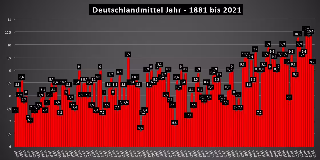 Und für unsere Wetterschwankungen darf ich doch sicher noch einmal die Aufzeichnungen der vergangenen 150 Jahre als Grafik einstellen, in denen die starken Schwankungen der jährlichen Mittelwerte sehr schön zu sehen sind: