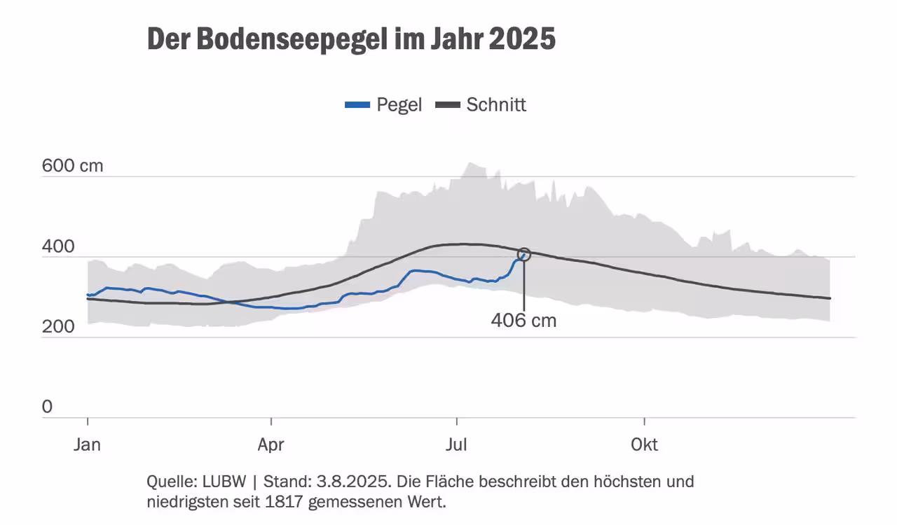 Nuja, der Pegel des Bodensees hat sich durch die jüngsten starken Niederschläge wieder erholt und liegt derzeit wieder auf dem langjährigen Durchschnittswert: